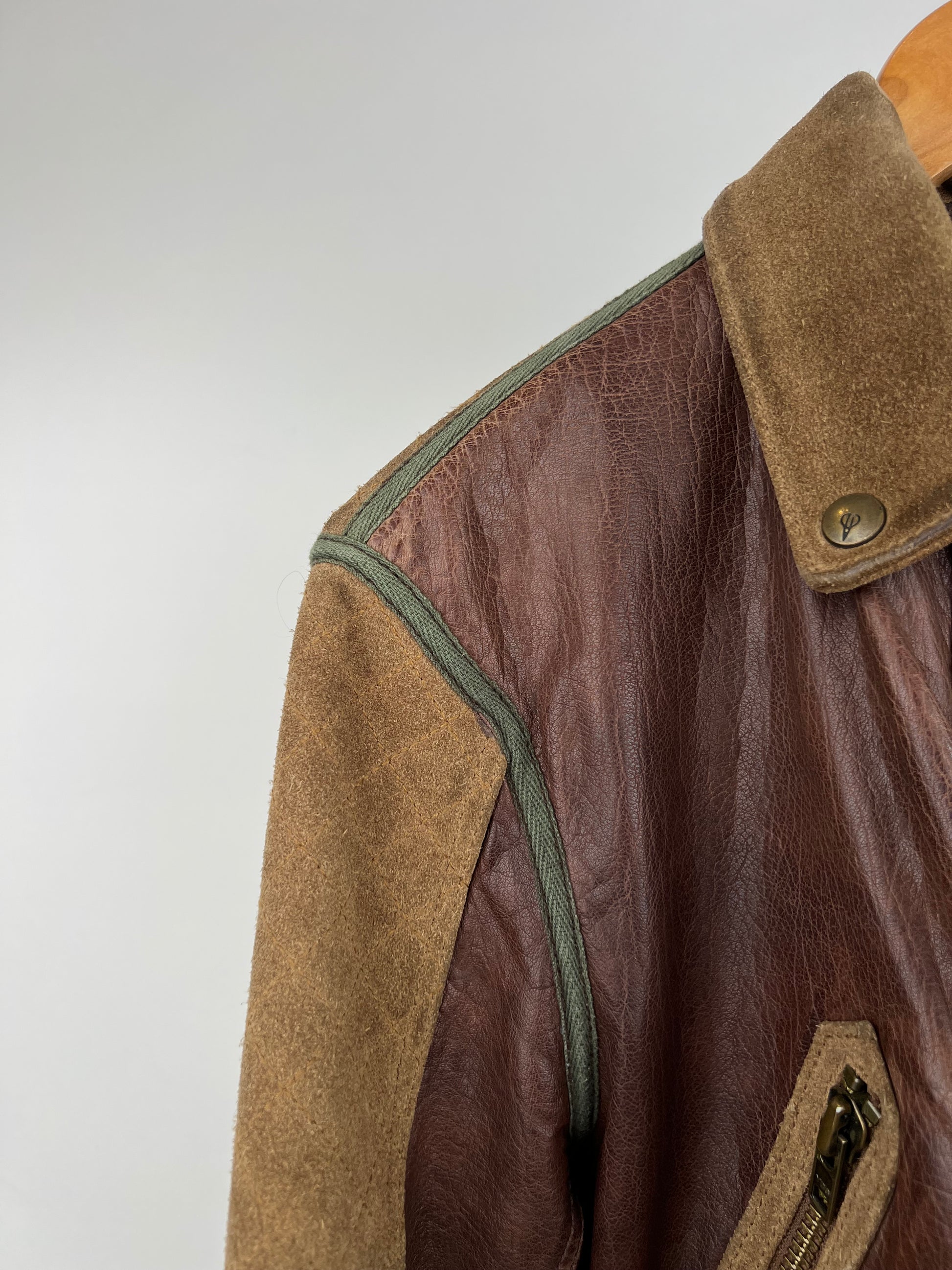 Iconic leather biker jacket. In a brown colourway with beautiful contrast colour block detailing.