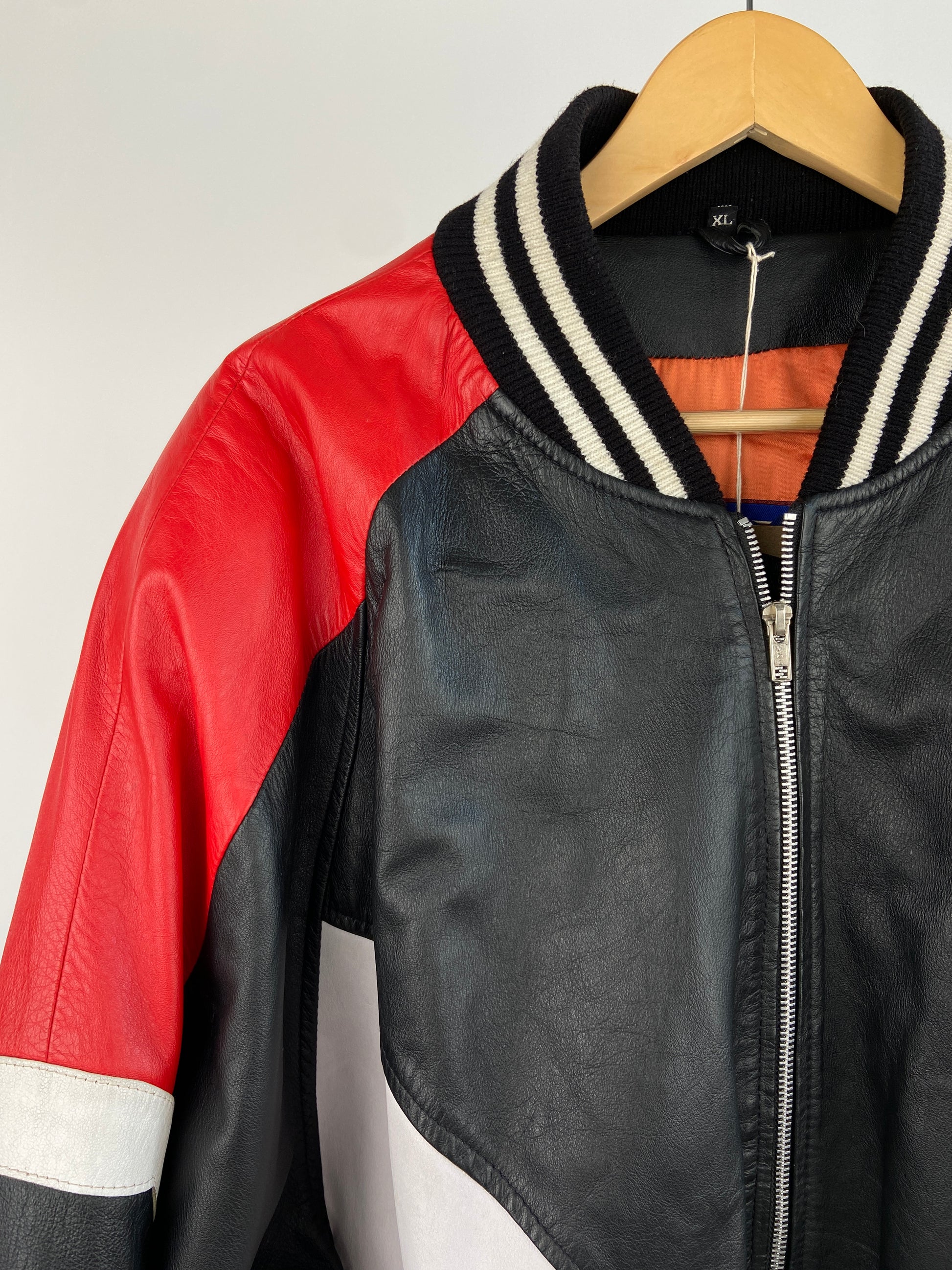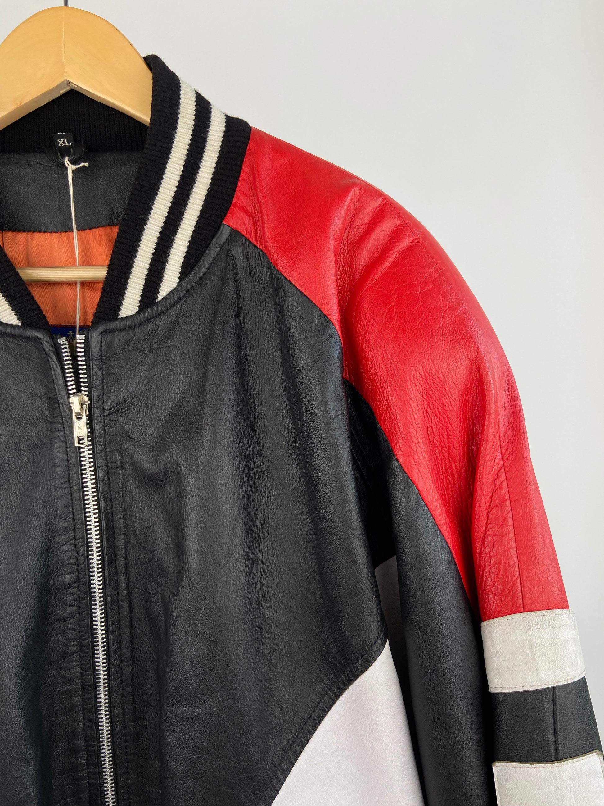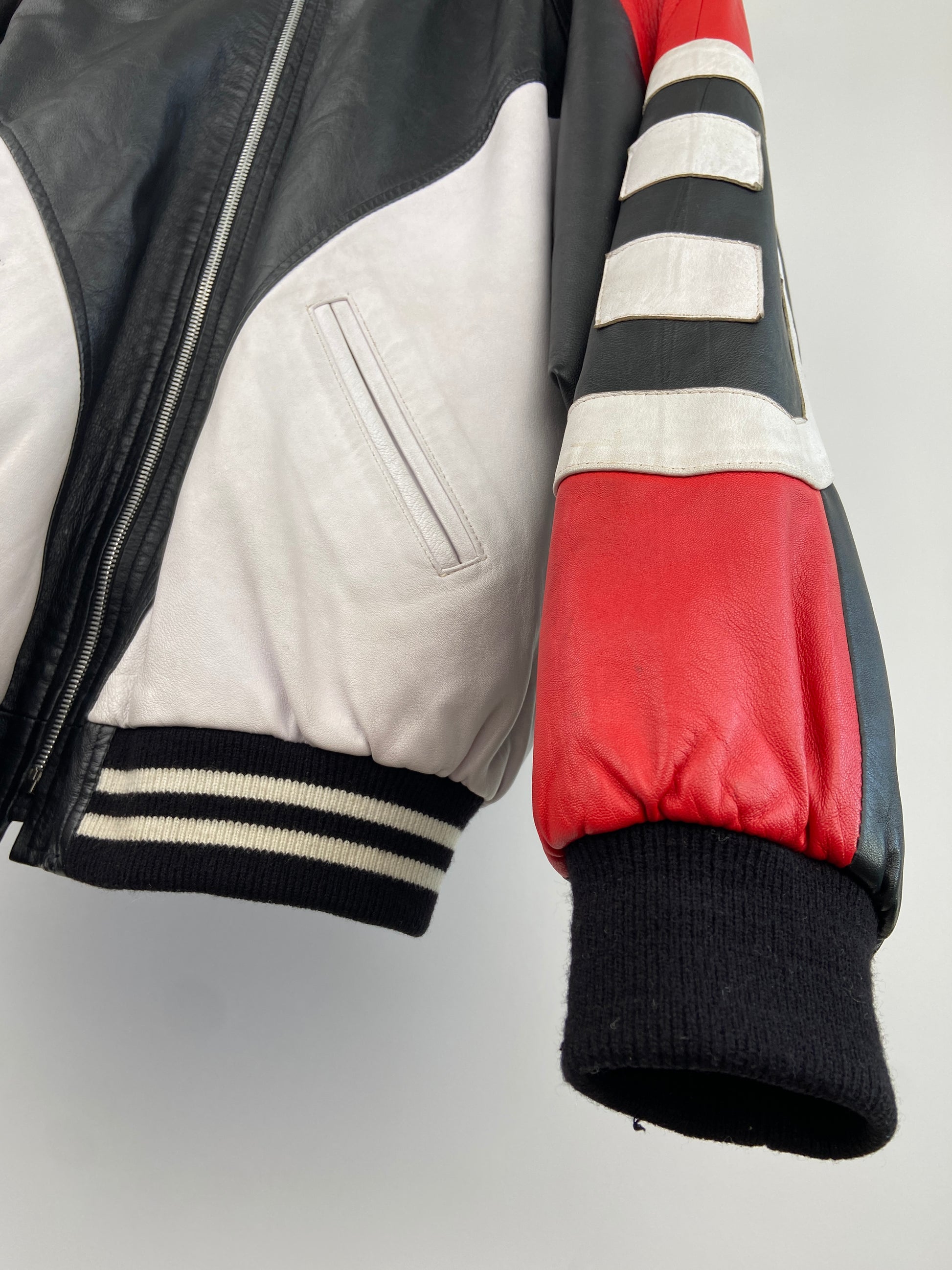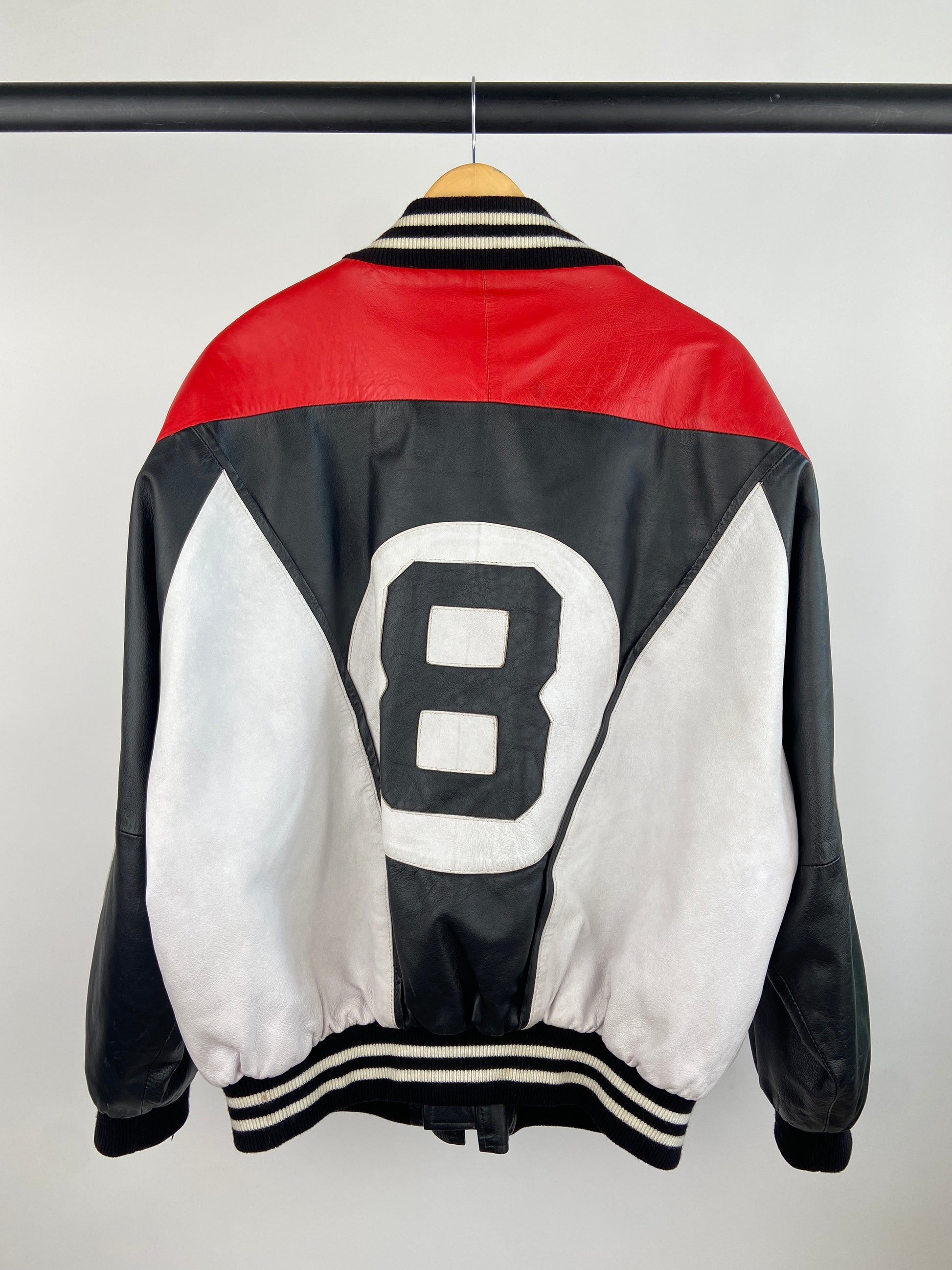 8 Ball 90s Leather Jacket. Incredible designer jacket made famous by Michael Hoban in San Francisco with the classic 8 ball logo on the back. Rare red, white & black colour way.