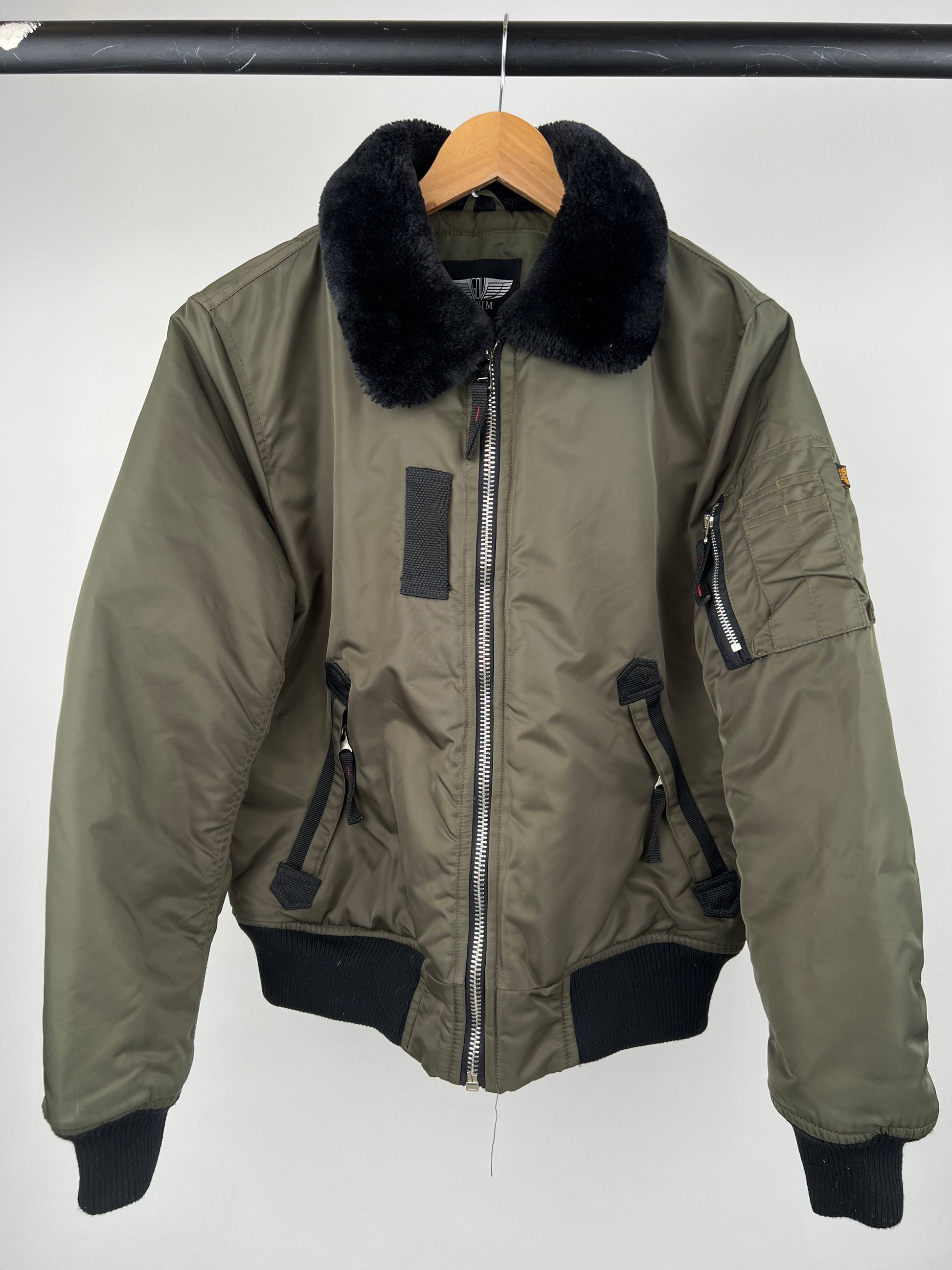 Vintage 90s MA1 military bomber jacket. With a faux fur collar attached. In an iconic olive green colourway.