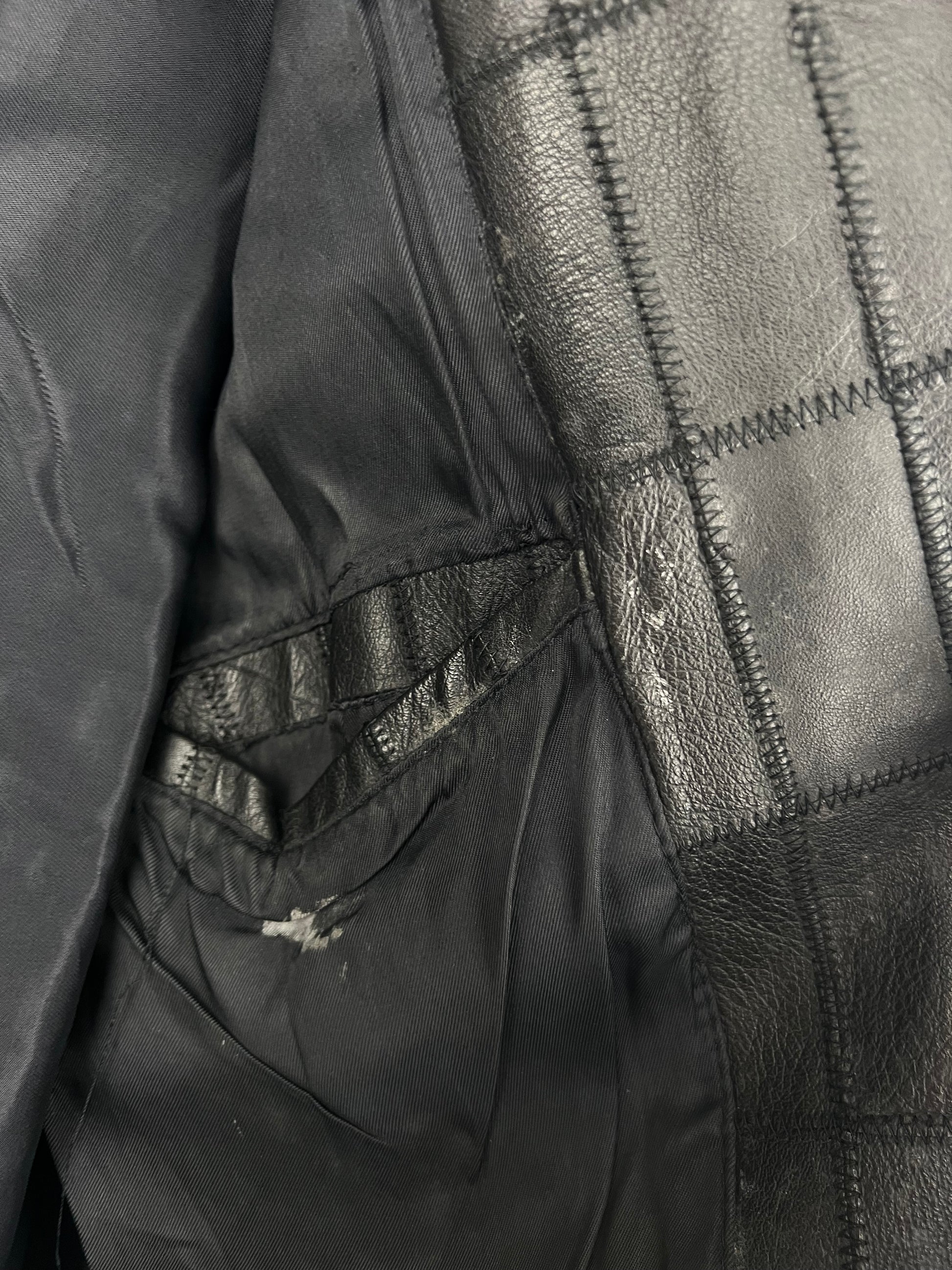 Beautiful black leather patchwork bomber jacket in a black colourway. Made in America in the 90s.