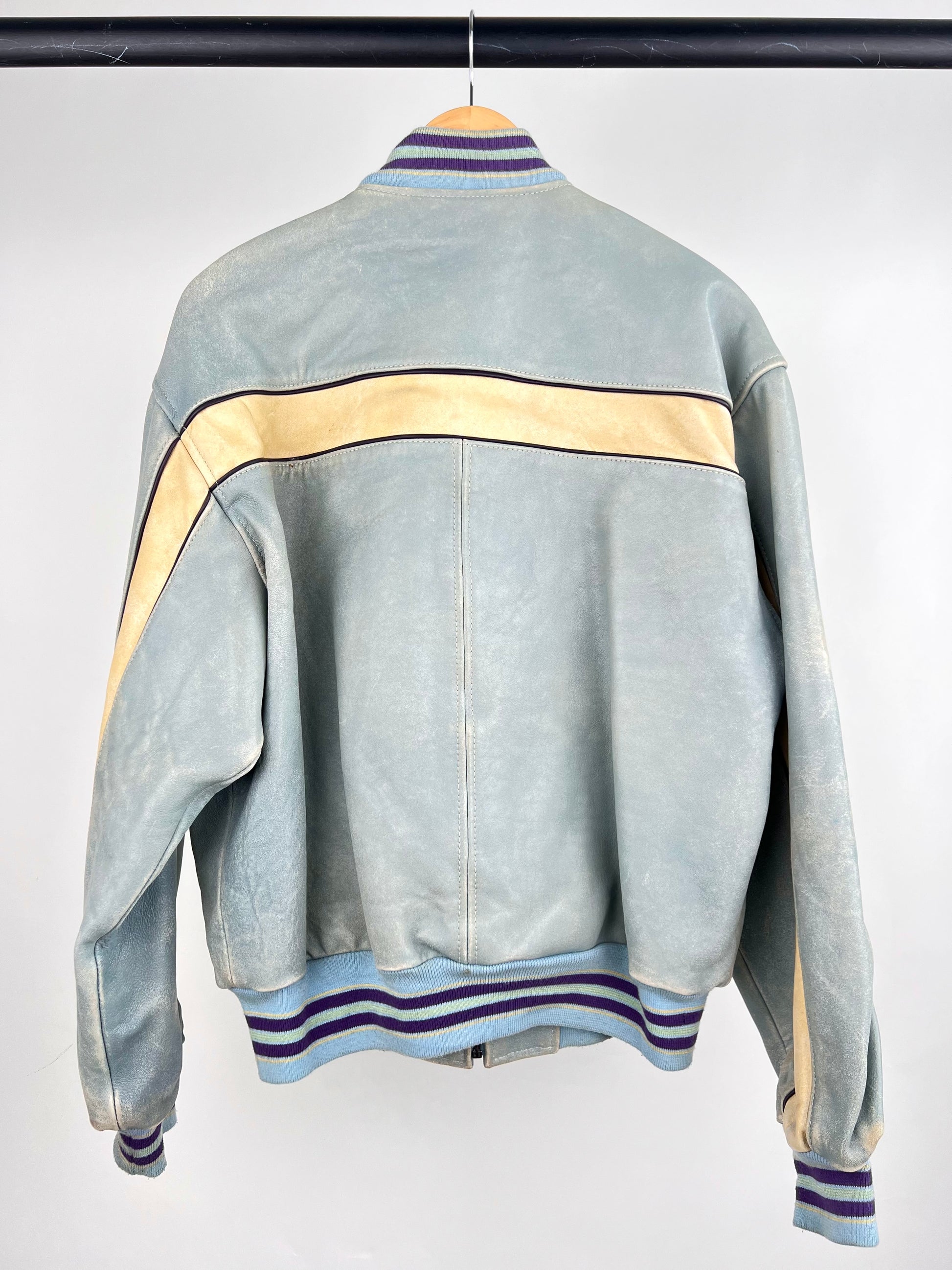 Iconic Ztribe leather baseball jacket. In a rare baby blue colourway with beautiful contrast colour block detailing. Made in America in the 90s.