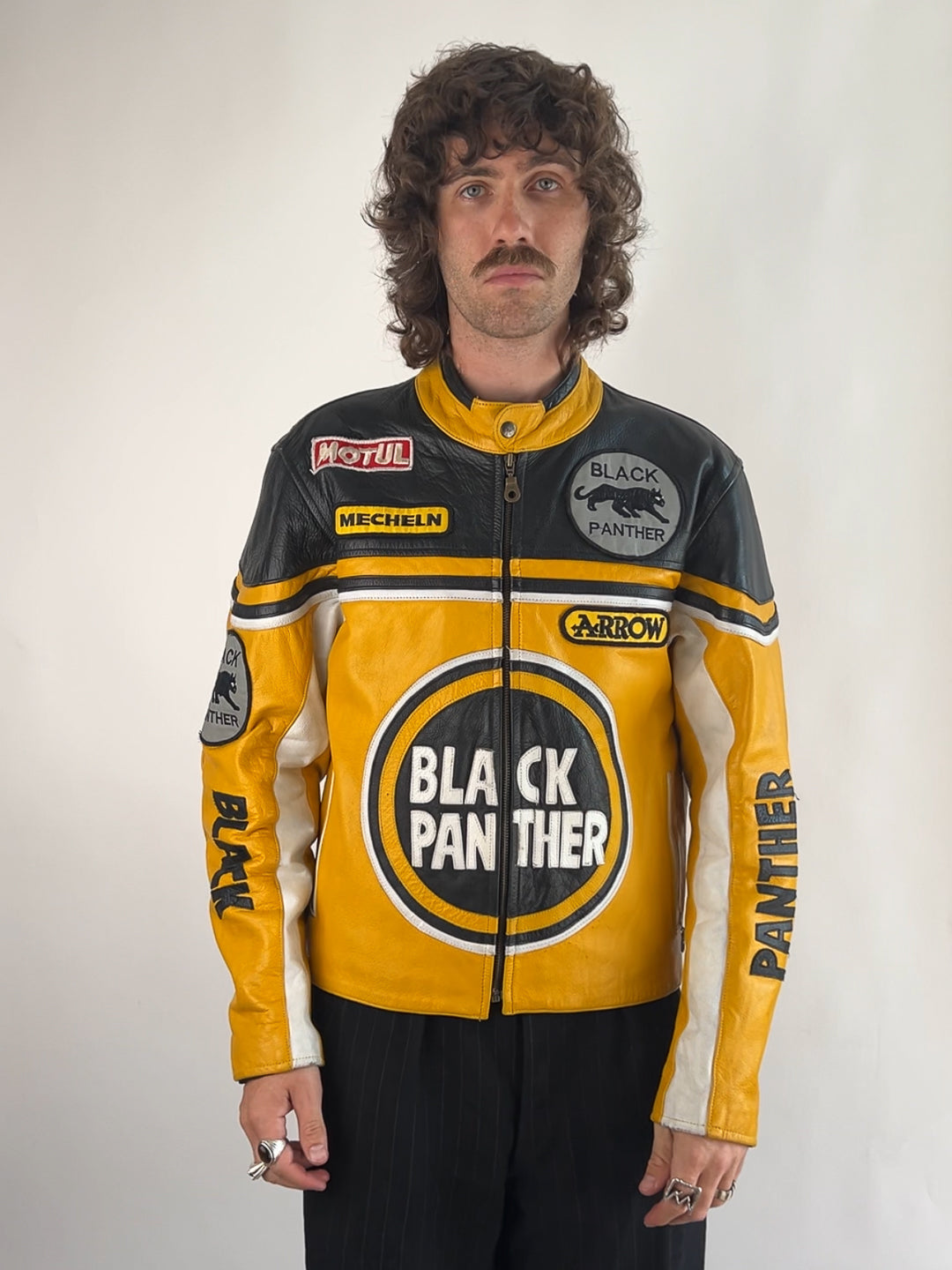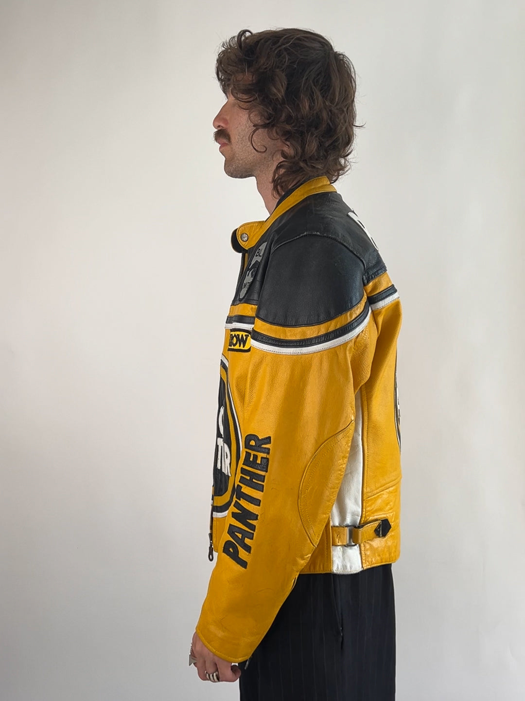 Black Panther 90s Leather Motorbike Jacket. In a yellow and black colour way. Rare design and jacket.